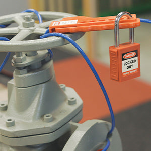 Route the cable where necessary to lockout the device then feed the cable down the centre of the open lockout. When the cable is tight and the source is locked out, squeeze the handle closed and apply padlock